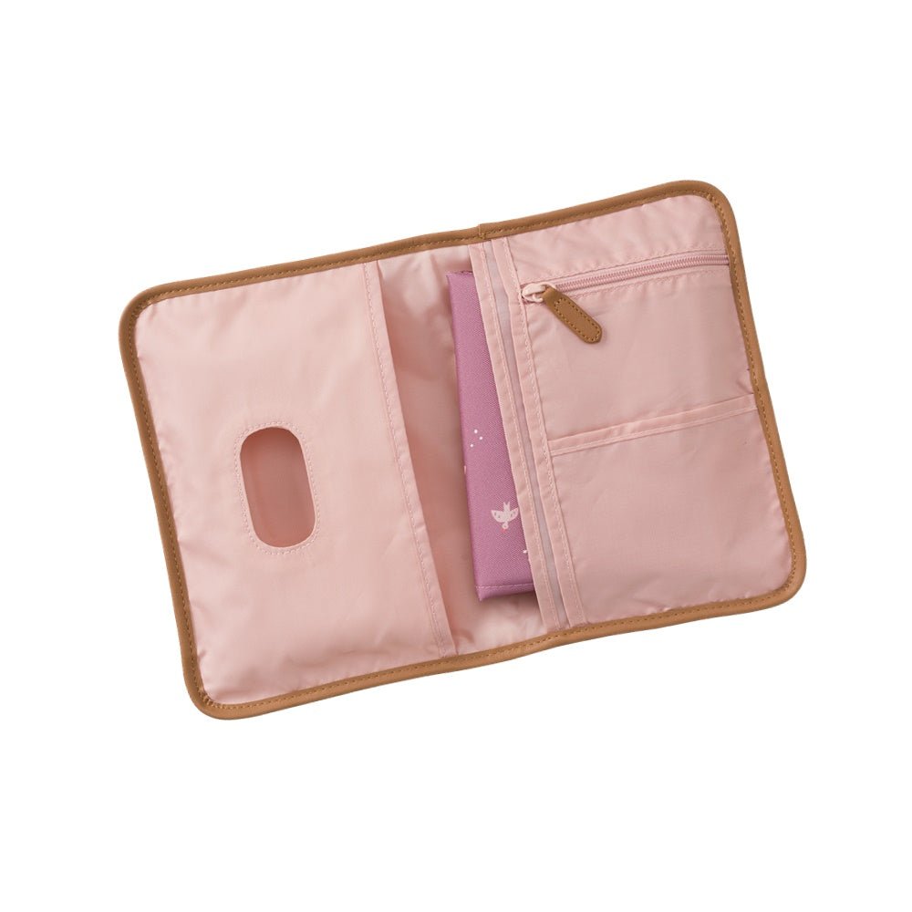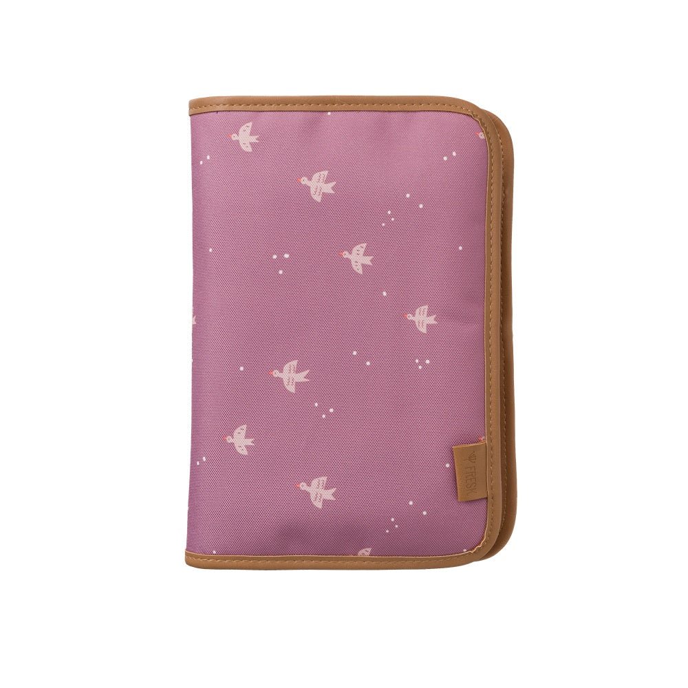 Bolsa-Cambiador de viaje impermeable Golondrinas , de la marca Fresk, está equipada con todo lo que necesitas para cuidar de tu peque fuera de casa. Tiene un cómodo bolsillo para meter las toallitas, y espacio suficiente para guardar hasta dos pañales. Incluye un cambiador plegable con el mismo bonito diseño de golondrinas sobre un fondo malva.