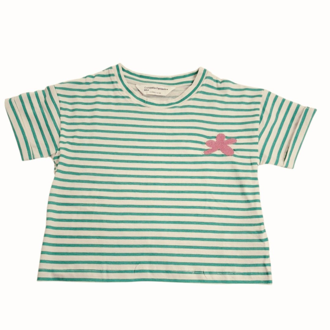Camiseta de niña tipo top, a rayas blancas y verdes, confeccionada 100% algodón. De manga corta, y con cuello redondo. Detalle bordado de flor fucsia a la altura del pecho. Compañía Fantástica.