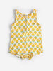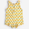 Mono corto tejido con estampado de fresas Bobo Choses es un mono amarillo y sin mangas, con cierre de botones delanteros y broches en la entrepierna, bordado, corte holgado, corto, tejido estructurado y tirantes anchos. Fabricado en España