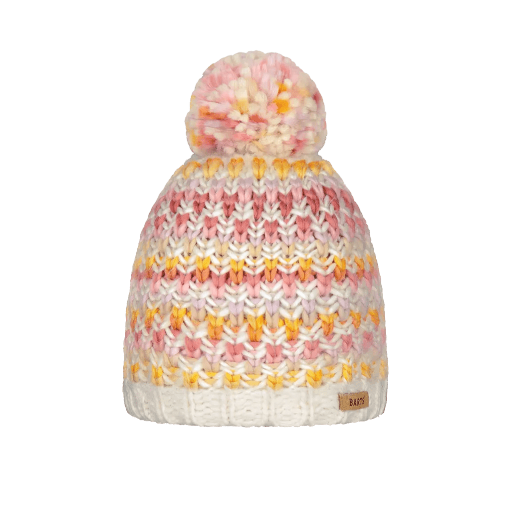 Gorro Nicole  Orquídea, tiene un pompón y un exclusivo punto jaspeado. Debido al hilo teñido en el espacio, cada gorro es único y el artículo puede diferir