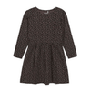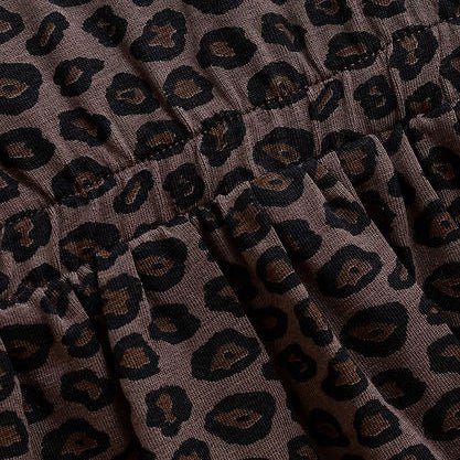 El precioso vestido Chocolat Chip, de la marca Minymo, es de punto elástico mezcla de Algodón y Modal*, de color marrón con estampado de leopardo en tonos marrón y negro. Tiene mangas largas con un ligero fruncido en los hombros. La cintura elástica le da un corte más ceñido y hace que la falda también tenga un ligero fruncido.