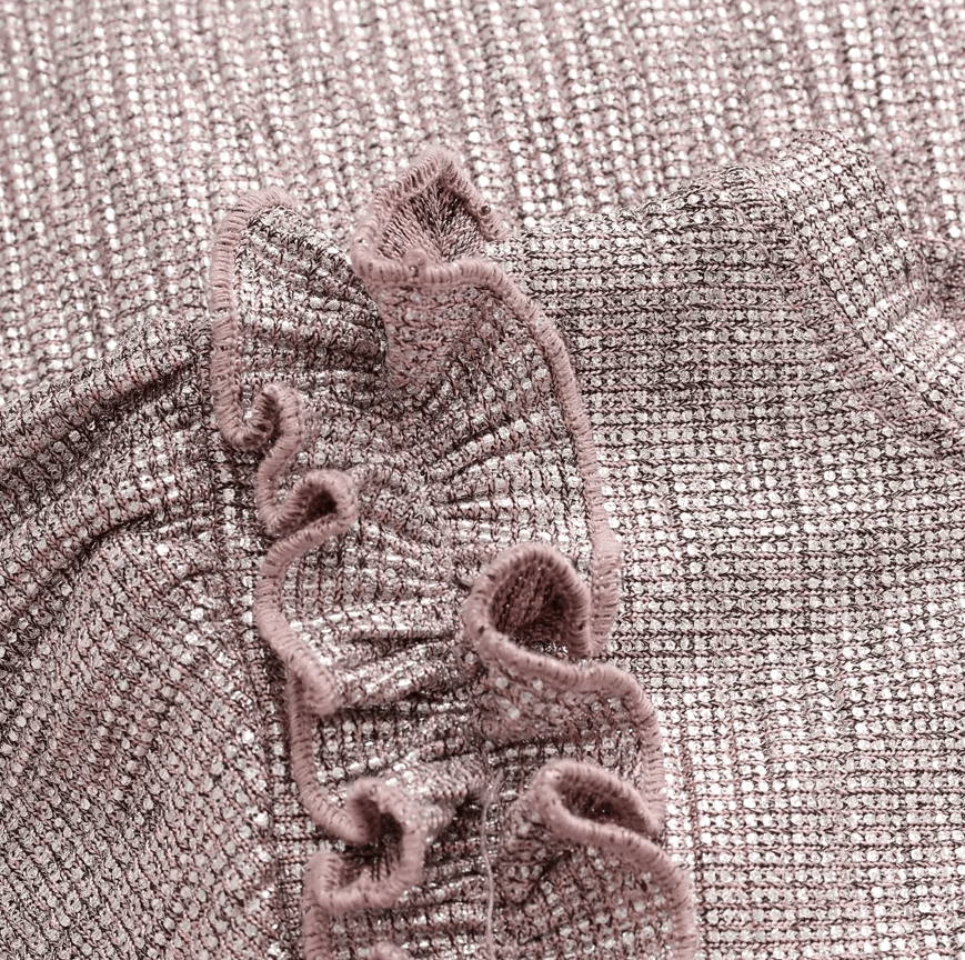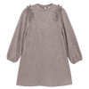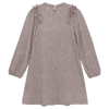 El precioso vestido de fiesta Woodrose, de la marca Minymo, tiene un diseño elegante de corte evasé, está confeccionado en tejido brillante de punto elástico, color rosa palo y plateado, cuello redondo ribeteado, y con botón detrás para facilitar el vestir, es de manga larga con volantes en los hombros, y con puños elásticos para un mejor ajuste.