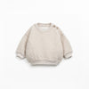 La Sudadera con Abertura en el Hombro de Play Up es de felpa y está confeccionada en punto con una mezcla de algodón, algodón reciclado y poliéster reciclado, en color crudo. Es un modelo con cuello redondo, puños y cinturilla elásticos, y abertura en el hombro con botones de coco.