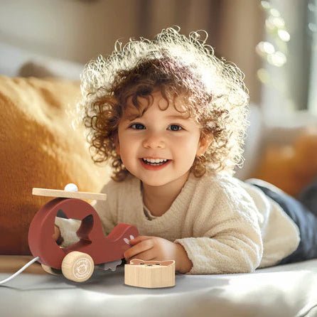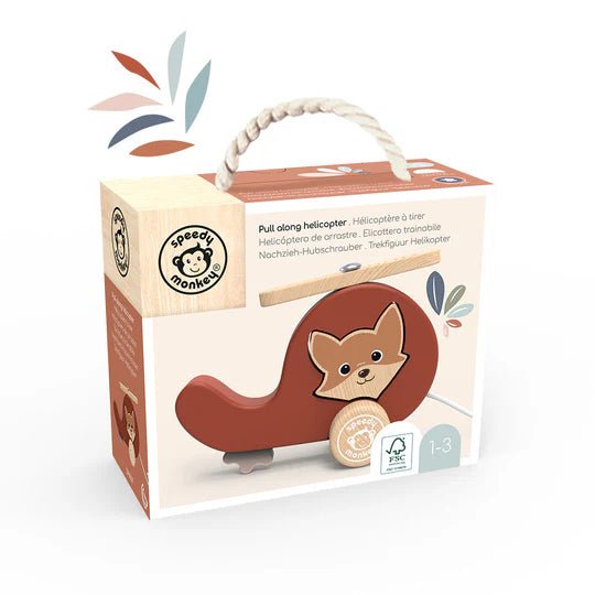 El Juego de arrastre Helicóptero, de la marca Speedy Monkey, es un colorido juguete de madera que, con sus formas sencillas y su diseño vibrante, ayuda a l@s más peques a desarrollar el juego imaginativo, la coordinación ojo-mano, la motricidad (al incorporar ruedas móviles y un cordón, le acompaña en sus primeros pasos) y la motricidad fina ( al incorporar también una pieza extraíble y encajable en el helicóptero), perfecto para niñ@s a partir de los 12 meses.