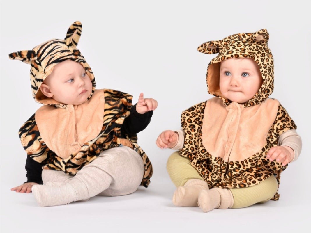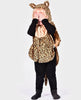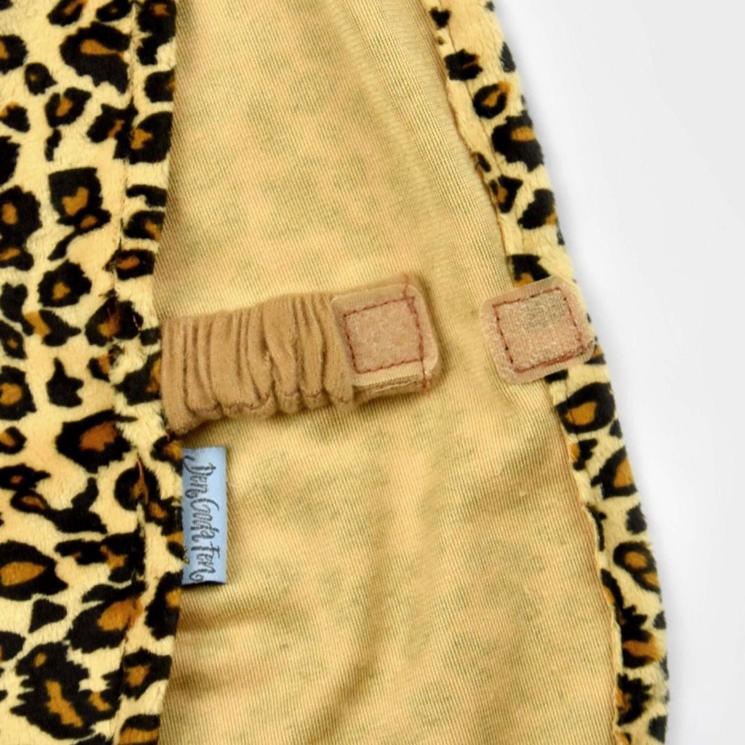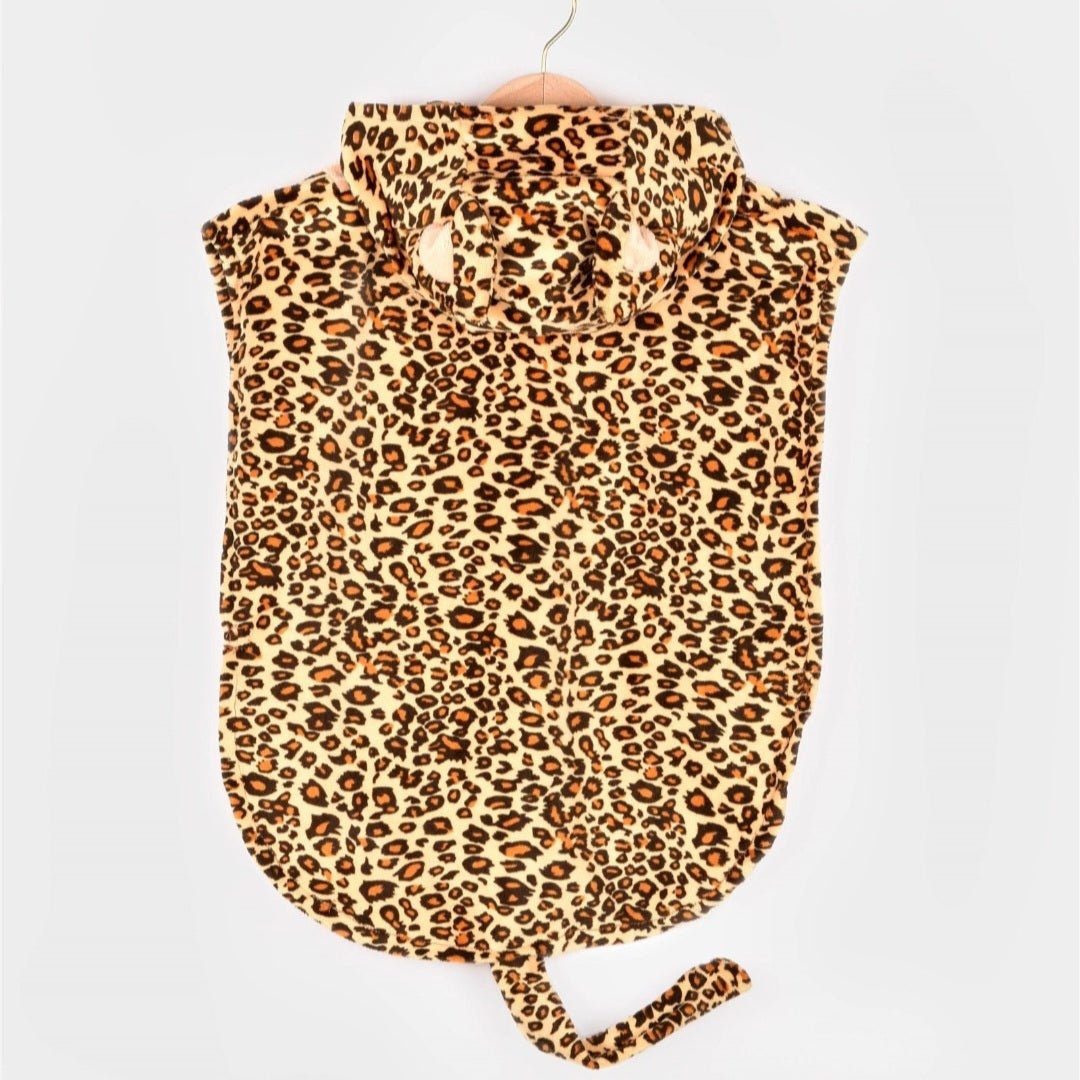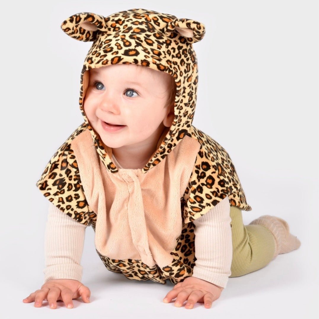 Disfraz de Leopardo de la marca Den Goda Fen. El disfraz se cierra con velcro por la parte delantera, incluye capucha cosida, con orejas incluida, y cola al final del disfraz. En ambos laterales tiene una banda elástica. Está fabricado con 100% poliéster.