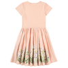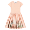 El vestido de manga corta Cissa Siesta, de la marca Molo, está confeccionado en algodón ORGÁNICO 100%* . De color rosa pálido , la parte superior es de punto de canalé y tiene cuello redondo y mangas cortas, la falda de popelina es de corte regular y va cosida con un fruncido en la cintura que le confiere mucho vuelo, y tiene un precioso estampado de caballos y flores sobre fondo también rosa suave.
