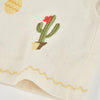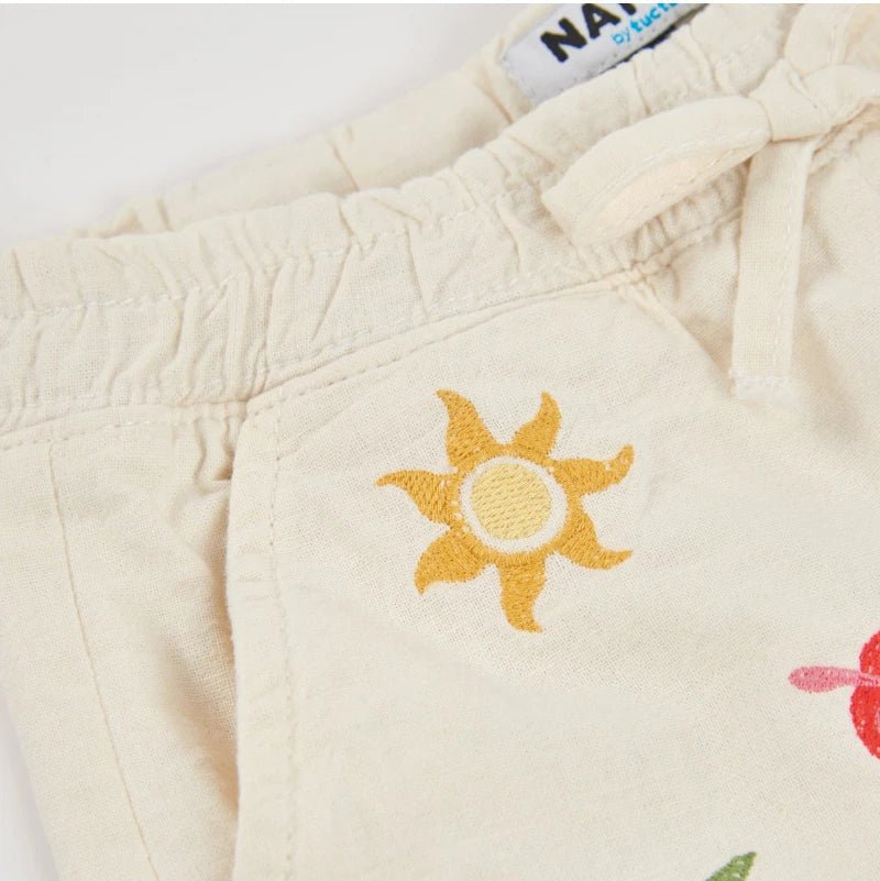 - Los Shorts , confeccionados en un tejido plano, ligero y agradable al tacto (mezcla de algodón y lino) que aporta comodidad durante todo el día. Son color crudo con unos preciosos bordados multicolor frontales, tienen cintura elástica con lazo decorativo. Los bolsillos laterales añaden practicidad a la prenda, mientras que el remate ondulado en el bajo completa el look con un toque distintivo.