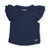 - El Top, confeccionado en punto de canalé de algodón (y una pizca de elastano) suave y confortable, se adapta con facilidad al movimiento. Color azul marino, su diseño sencillo se embellece con unas mangas de volantes formadas por varias capas plisadas. El bajo incorpora una pequeña placa metálica decorativa, un detalle sutil que añade un toque distintivo sin recargar la prenda.