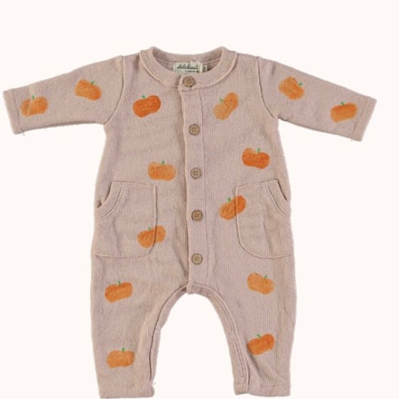 El Mono Rosa Calabazas, de la marca Lolaletost*, está confeccionado en punto elástico de algodón 100%, con interior cardado para mayor confort térmico, es de manga larga y cuello redondo, va abotonado al frente con botones de madera, y tiene cierres automáticos en las perneras para facilitar el cambio de pañal sin tener que desvestir a tu peque. Tiene dos bolsillos frontales funcionales. Es muy cómodo, adaptable, suave y calentito.