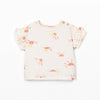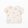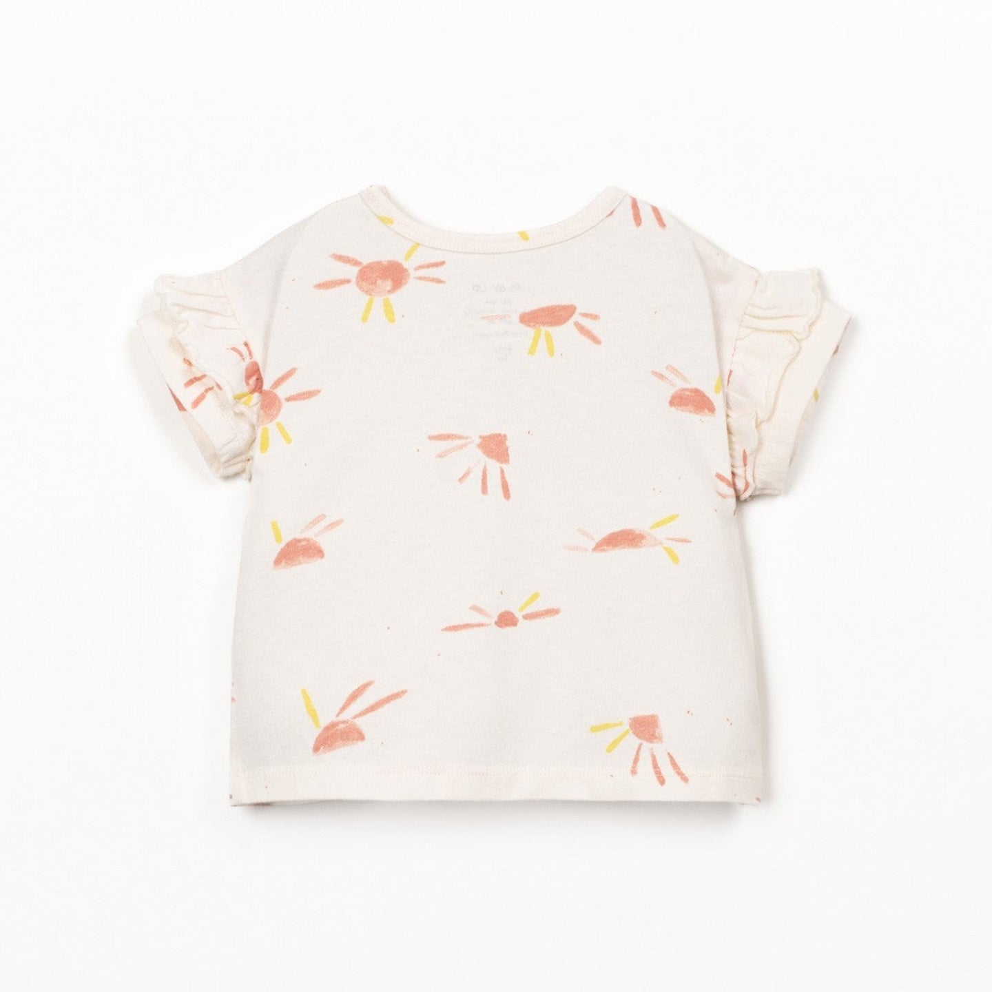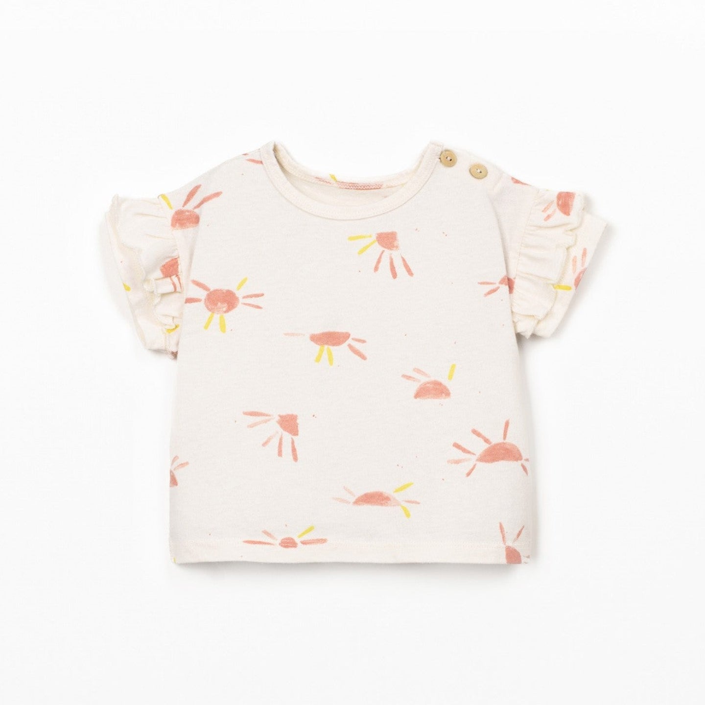• una camiseta  (con un precioso estampado de soles sobre un fondo crema, presenta cuello redondo y manga corta, abertura al hombro con botones de coco para facilita el vestir, y tiene tratamiento anti-UV)