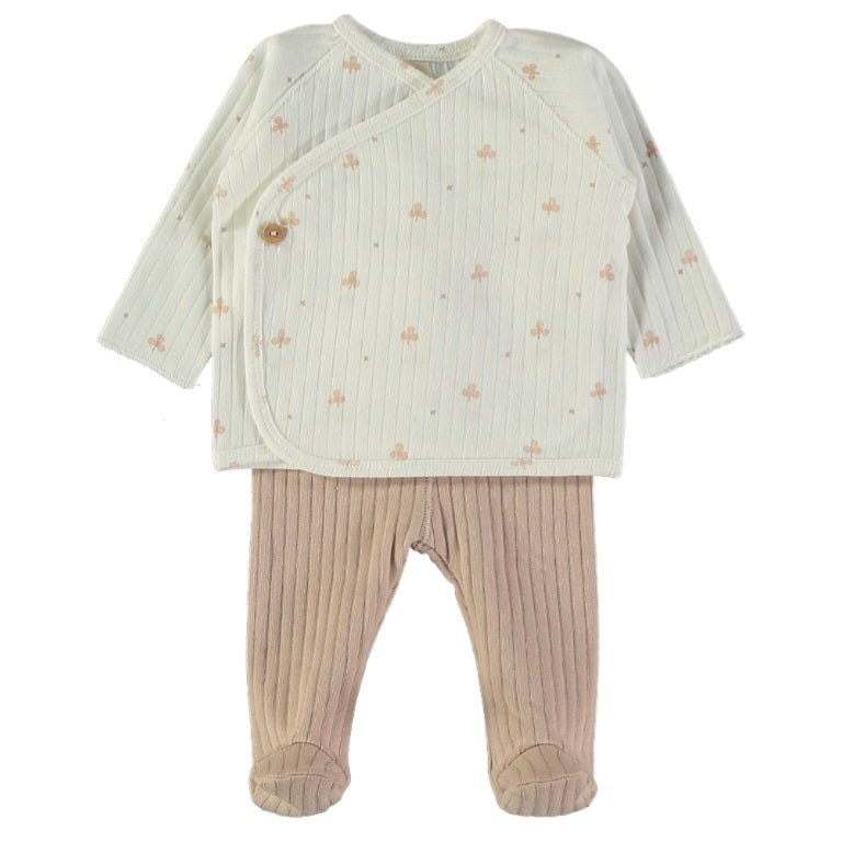 El conjunto de dos piezas de canalé Easy Clovers Nude*, de  la marca Lillymom, hecho de suave algodón ORGÁNICO , está pensado para facilitar la cura del cordón umbilical hasta que éste se caiga.