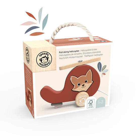 El Juego de arrastre Helicóptero, de la marca Speedy Monkey, es un colorido juguete de madera que, con sus formas sencillas y su diseño vibrante, ayuda a l@s más peques a desarrollar el juego imaginativo, la coordinación ojo-mano, la motricidad (al incorporar ruedas móviles y un cordón, le acompaña en sus primeros pasos) y la motricidad fina ( al incorporar también una pieza extraíble y encajable en el helicóptero), perfecto para niñ@s a partir de los 12 meses.