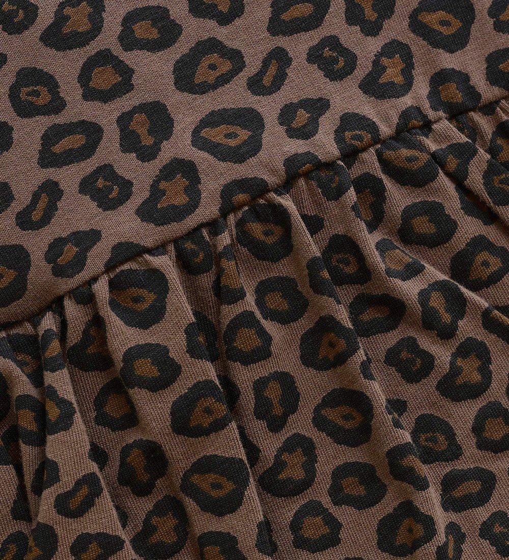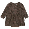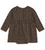El precioso vestido-body Chocolat Chip, de la marca Minymo, es de punto elástico de Algodón ORGÁNICO y una pizca de elastano para darle mayor elasticidad, es de color marrón con estampado de leopardo en tonos marrón y negro. Tiene mangas largas con un ligero fruncido en los hombros. Cuello redondo y cierre a la espalda con broches a presión. La cintura elástica le da un corte más ceñido y hace que la falda también tenga un ligero fruncido. Debajo de la falda es un body con cierre de broches a presión para facilitar el cambio de pañal.