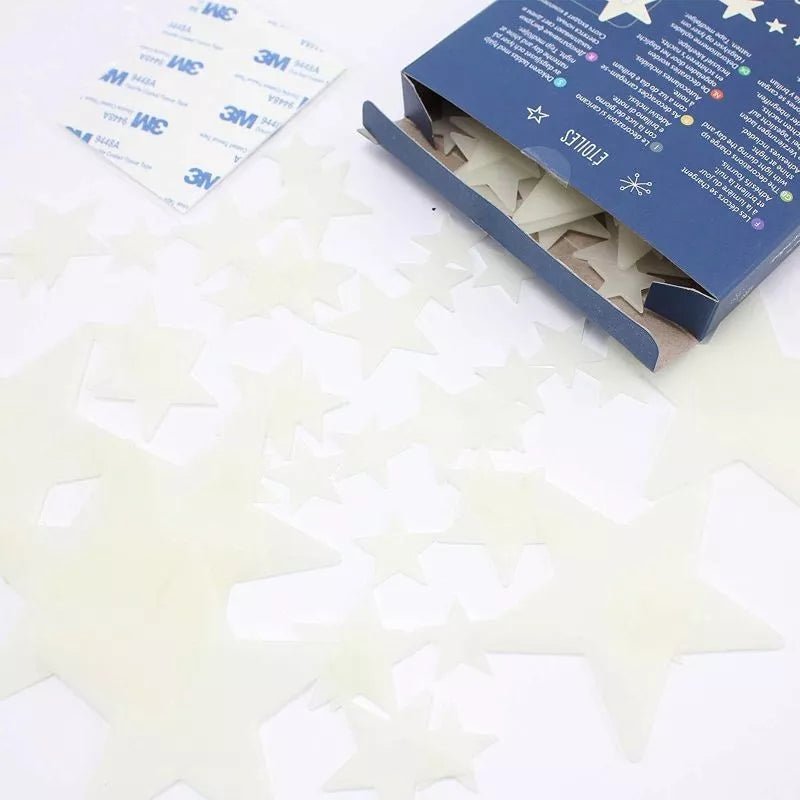 - La caja contiene 65 piezas de plástico fosforescente con forma de estrella, y con adhesivo de espuma de doble cara para fijarlas a las paredes.