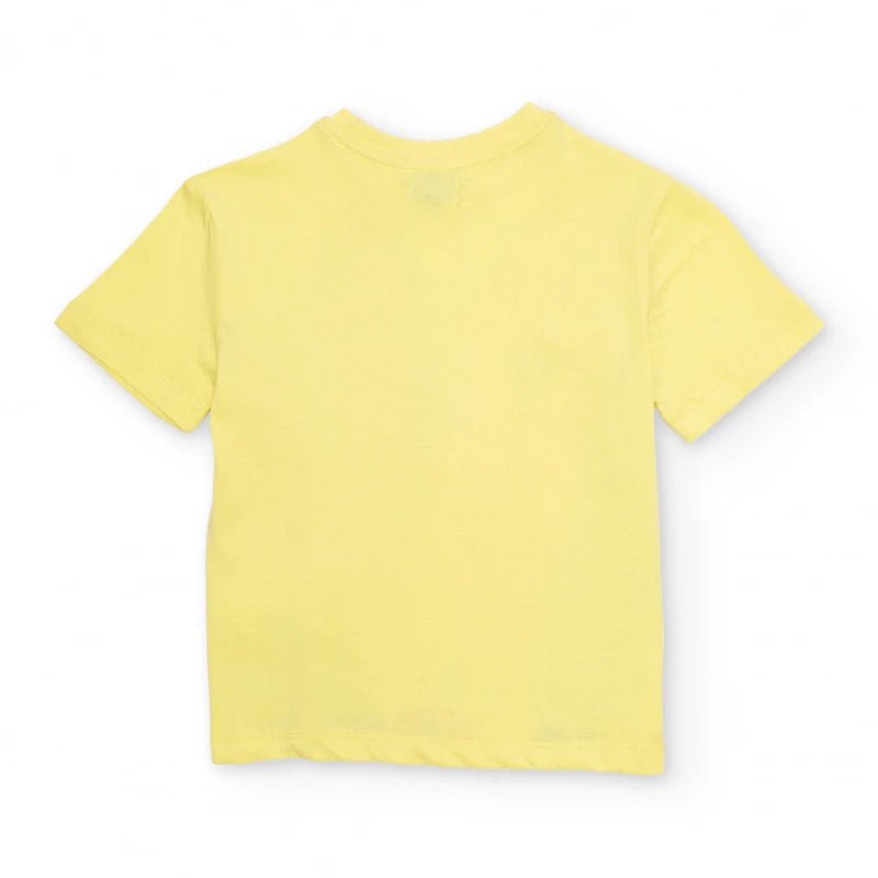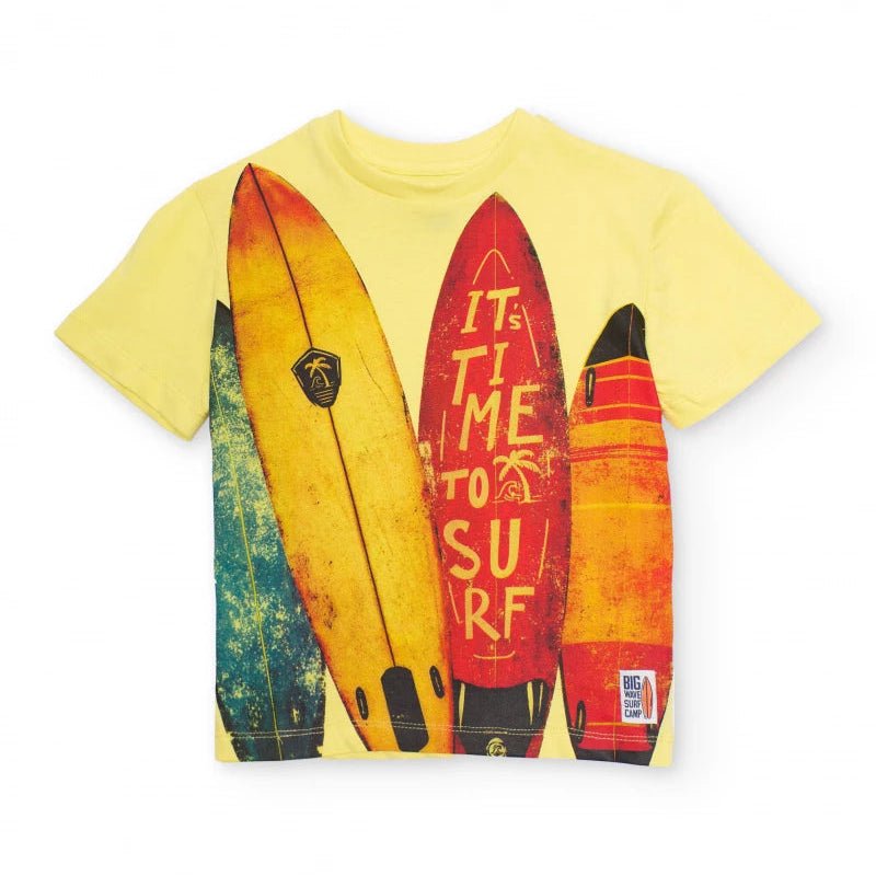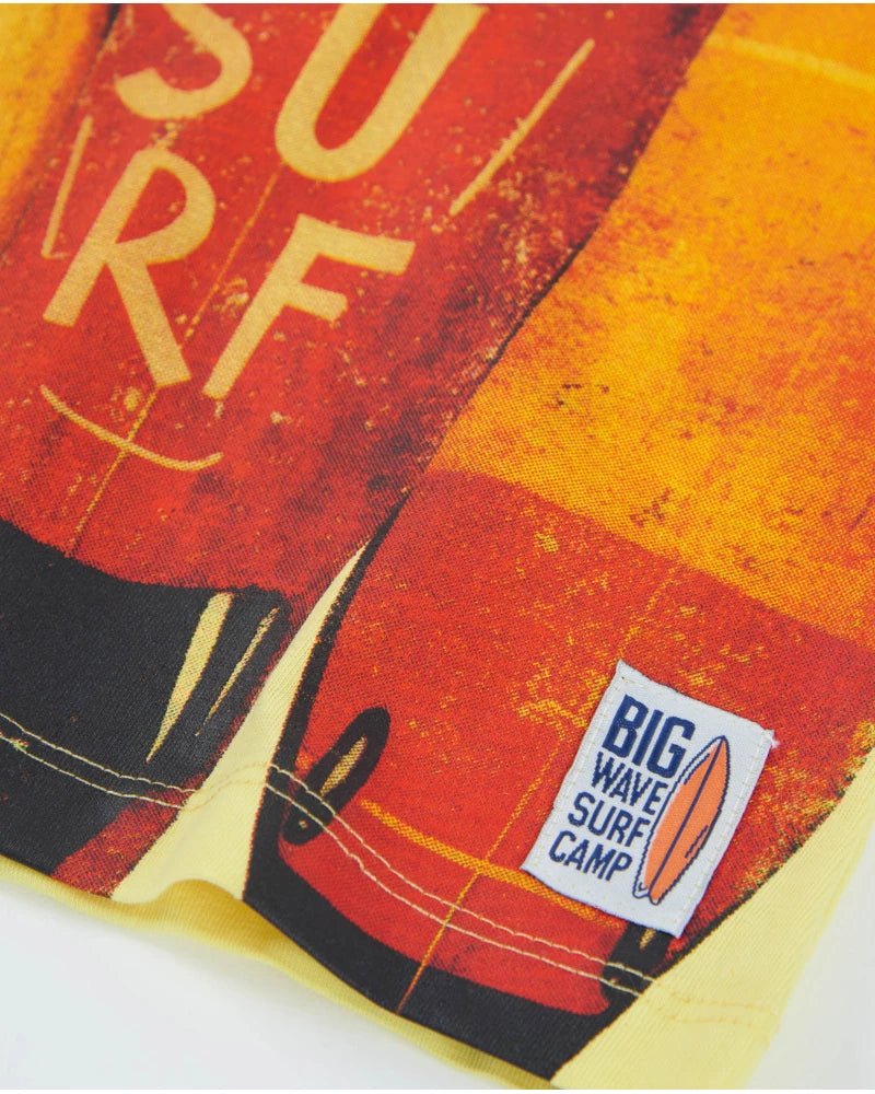 La Camiseta Surf Camp, de la marca Nath Kids, confeccionada en punto de algodón 100%, de un vibrante color amarillo, tiene un estampado frontal de tablas de surf en tonos también muy vibrantes, con un diseño que combina efecto desgastado y tipografía veraniega. Su corte recto facilita una caída natural y versátil, convirtiéndola en una prenda ideal para dar un aire fresco y aventurero.