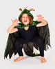 Capa-Disfraz de dragón,verde con detalles dorados, de la marca Den Goda Fen. La capa tiene una capucha cosida, con cuernos. También incluye alas en color dorado en la zona de los hombros y una cola con púas que va desde el cuello hasta el suelo. Se cierra con velcro en el cuello. Fabricada con 100% poliéster.
