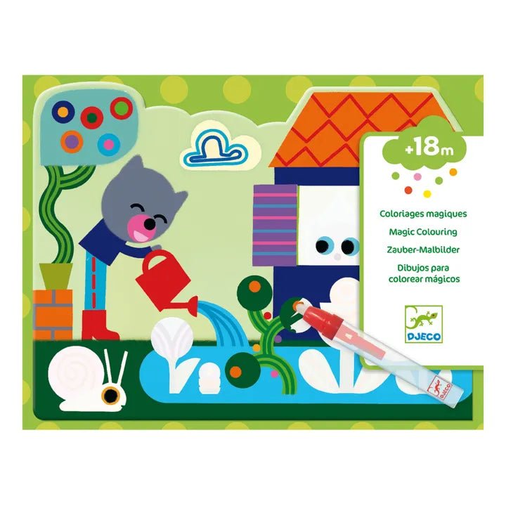 Colorea Mágico con agua – Escondido en el Jardín de Djeco es una divertida y original actividad creativa para niñas y niños a partir de 18 meses. Solo necesitan llenar el lápiz con agua y pasarlo sobre las ilustraciones para ver cómo los colores mágicamente aparecen. ¡Después de secarse, podrán empezar de nuevo una y otra vez!