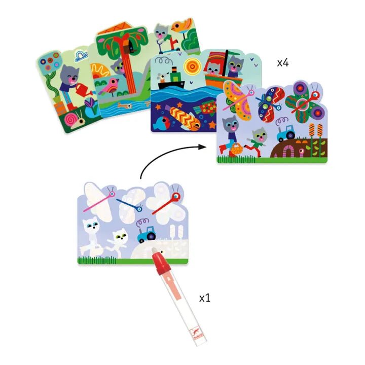 El set incluye 4 láminas de plástico blando ilustradas con adorables escenas y un lápiz de agua especialmente diseñado para manos pequeñas.