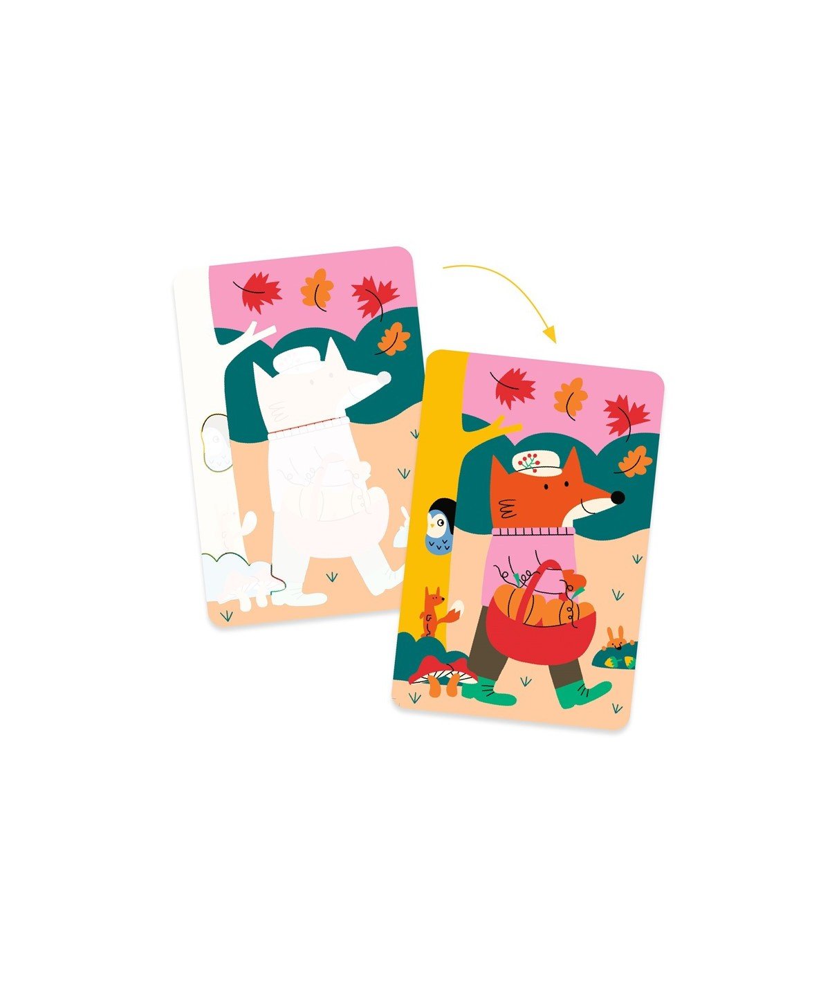 Divertido set de colorear en agua 4 estaciones con temática de las estaciones del año de Djeco, que incluye 4 láminas reutilizables y 1 bolígrafo mágico de agua. Solo hay que llenar el bolígrafo con agua y pasarlo por las zonas en blanco para que los colores aparezcan como por arte de magia.