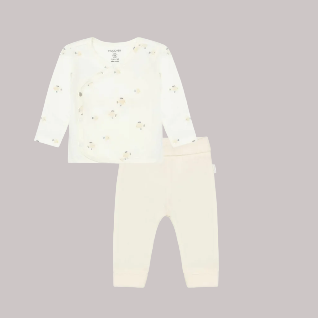 El Conjunto 1a Puesta Egret Sand, de la marca Noppies, confeccionado con suave algodón ORGÁNICO 100% ( Certificación GOTS CERES-0366*) y una pizca de elastano para mayor elasticidad, consta de :