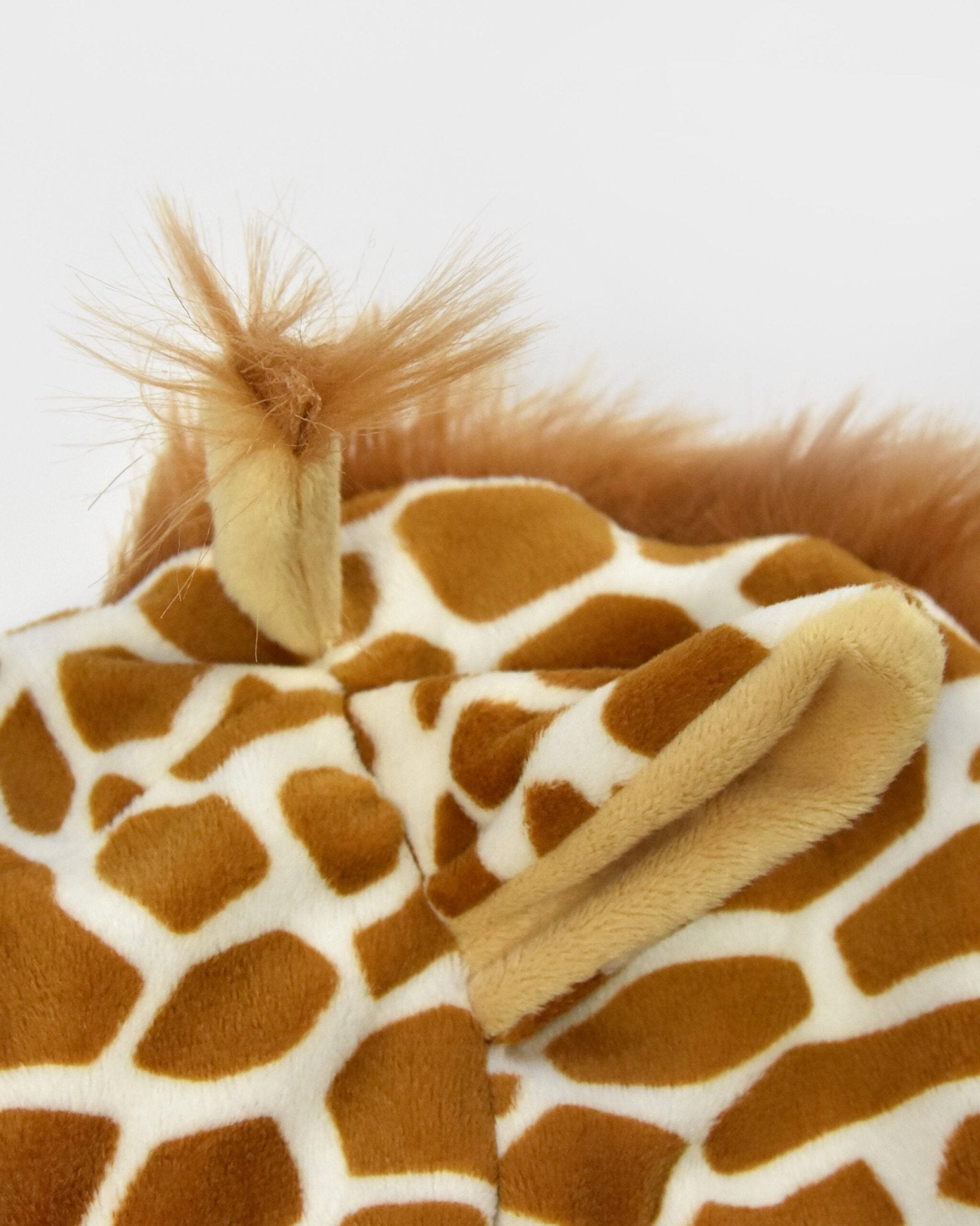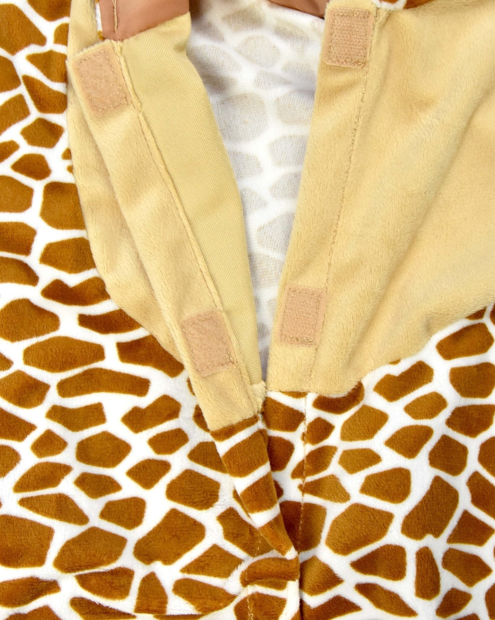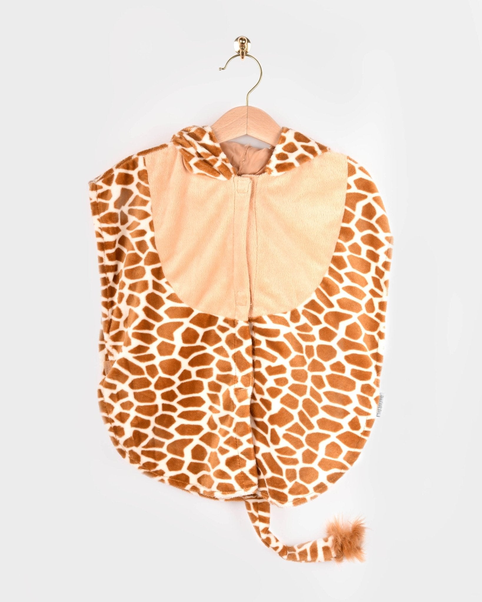 Disfraz de Jirafa de la marca Den Goda Fen. El disfraz se cierra con velcro por la parte delantera, incluye capucha cosida con orejas y pelo de cresta, y con cola al final del disfraz. En ambos laterales tiene una banda elástica. Está fabricado con 100% poliéster.