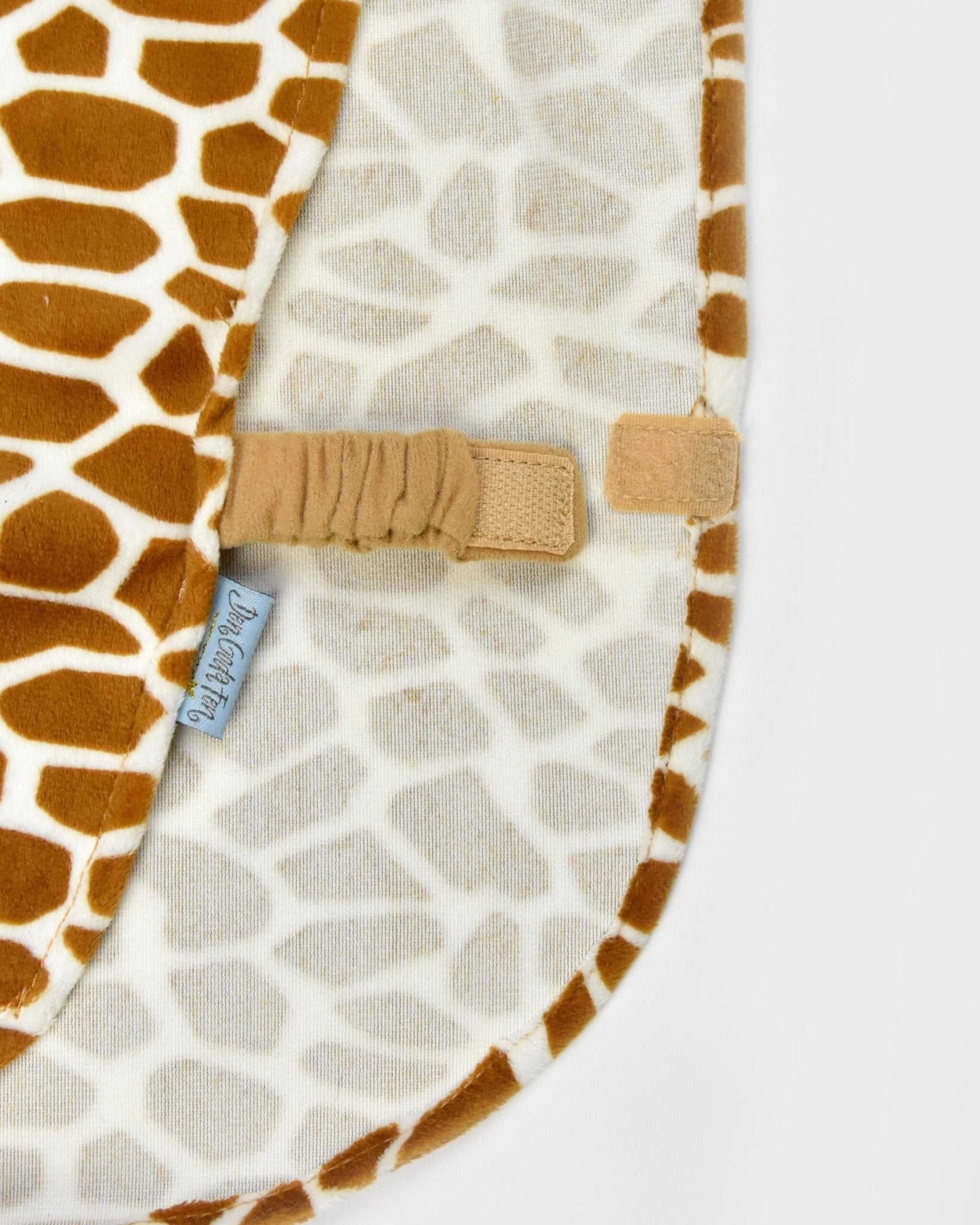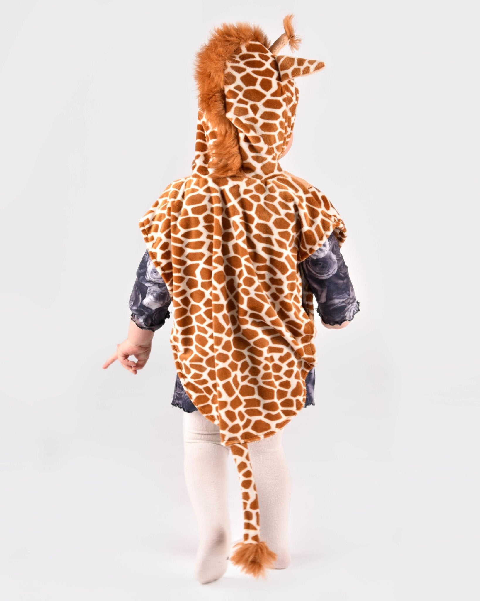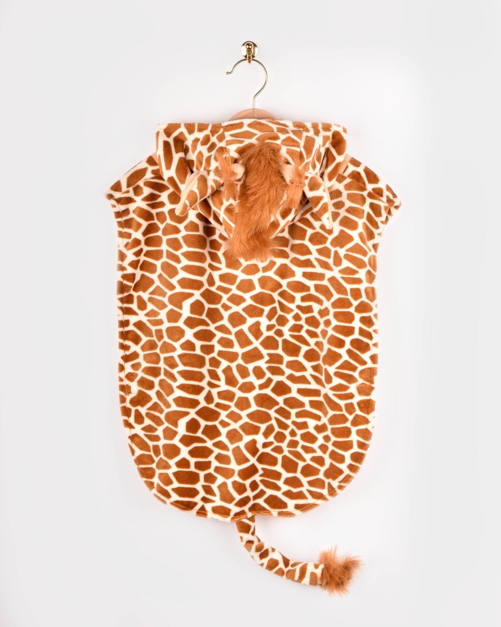 Disfraz de Jirafa de la marca Den Goda Fen. El disfraz se cierra con velcro por la parte delantera, incluye capucha cosida con orejas y pelo de cresta, y con cola al final del disfraz. En ambos laterales tiene una banda elástica. Está fabricado con 100% poliéster.