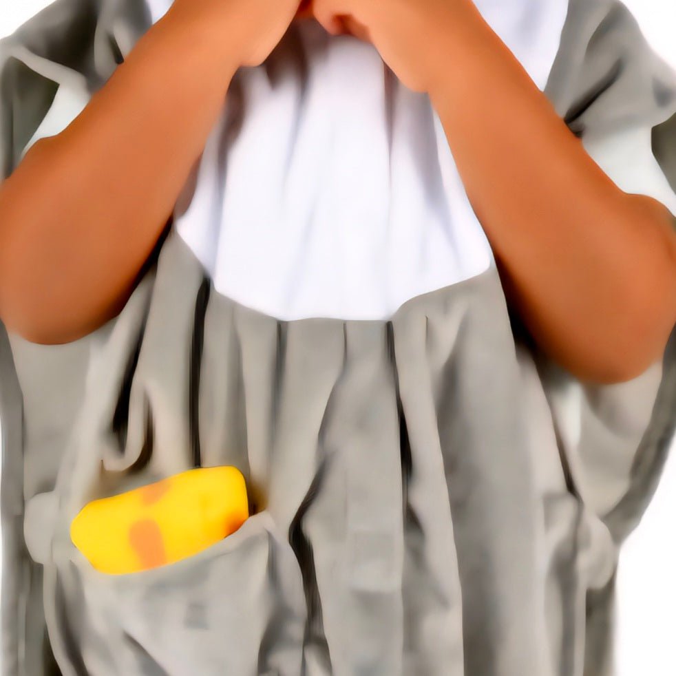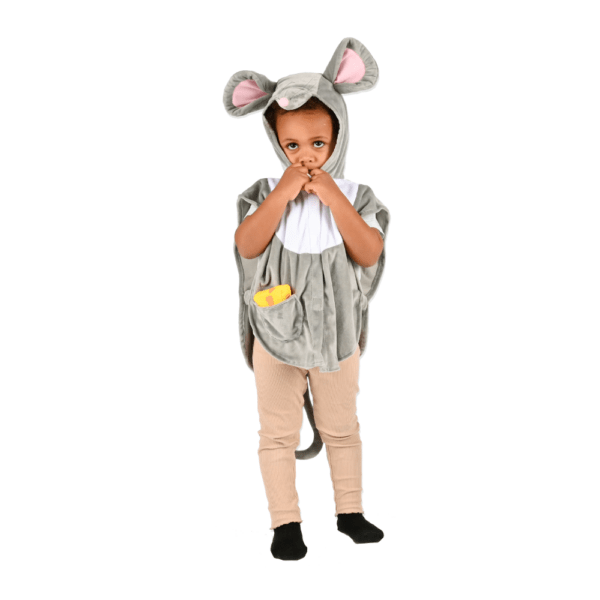 Disfraz de Ratón, de la marca Den Goda Fen. El disfraz se cierra con velcro por la parte delantera, incluye capucha cosida con orejas, con cola al final del disfraz, y un divertido trozo de queso en el bolsillo derecho En ambos laterales tiene una banda elástica. Está fabricado con 100% poliéster.