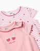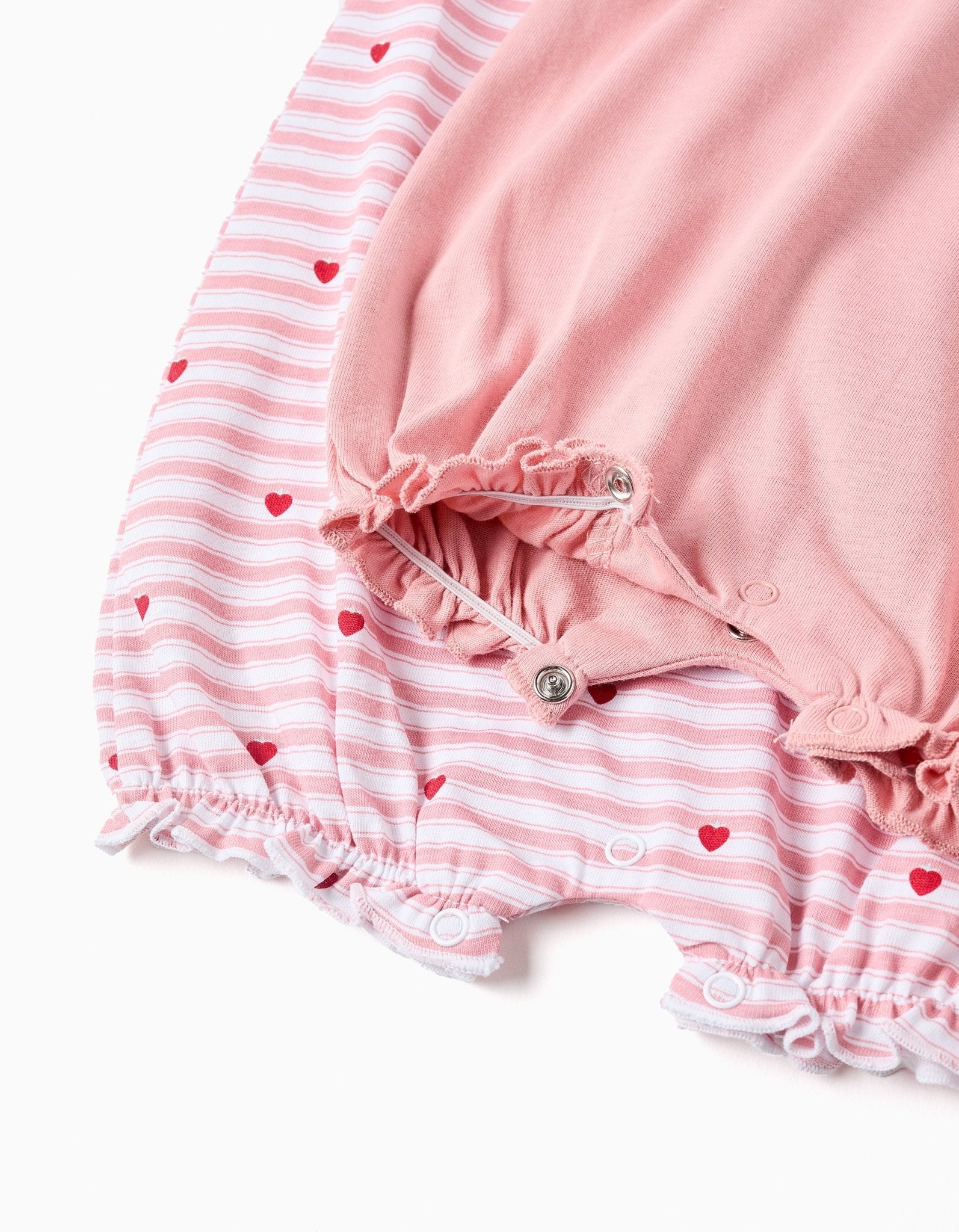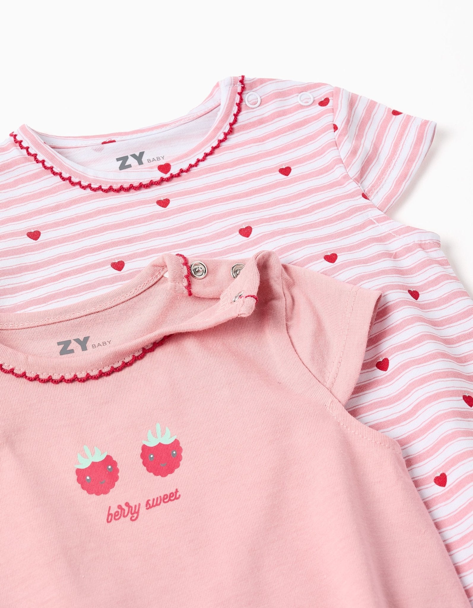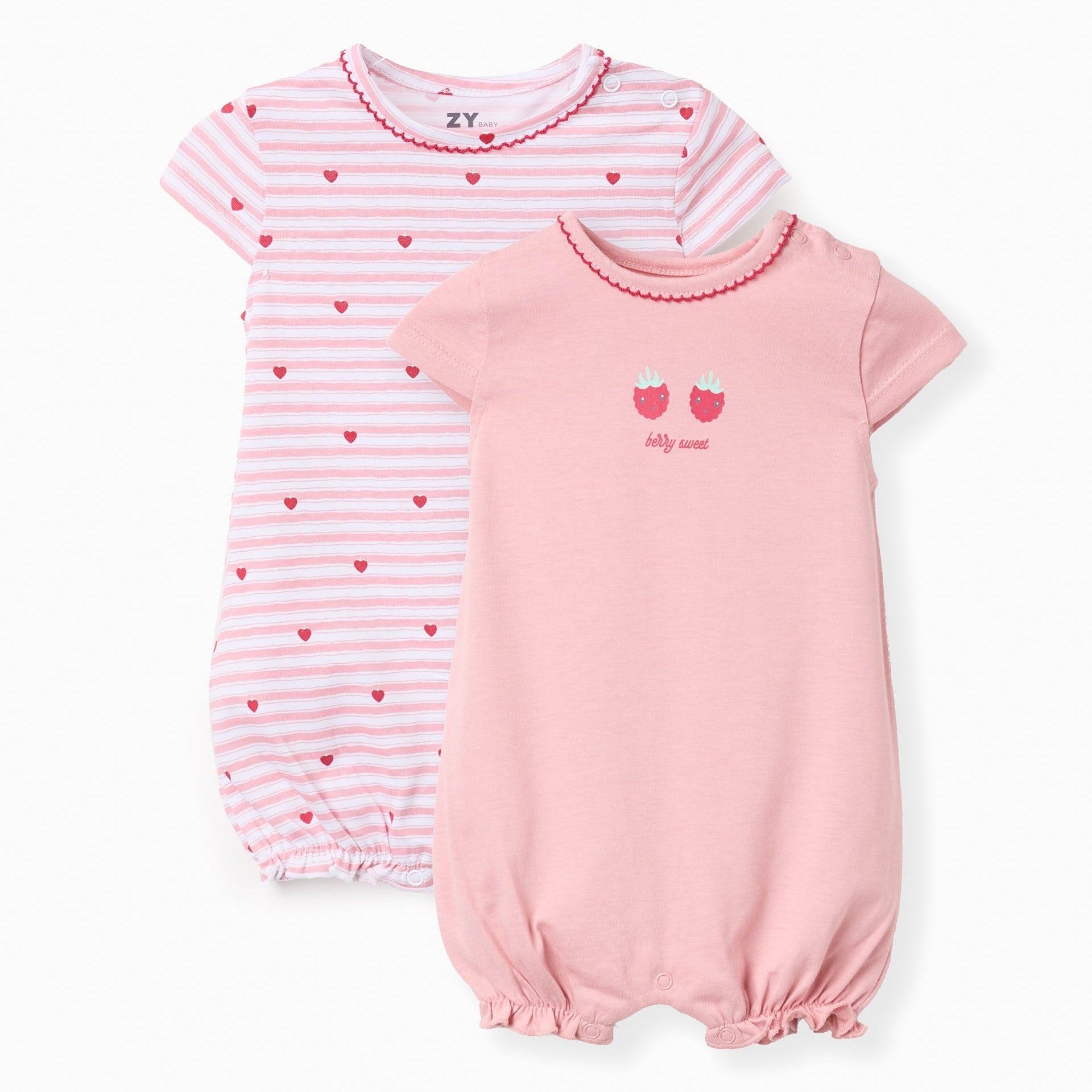 Pack 2 Pijamas-Mono Bebé de Algodón Berry ZY de manga corta para bebé, 100% algodón. Incluye un body estampado de corazones, uno rosa liso con estampado frontal Cierres en el hombro y la entrepierna para vestir fácilmente. Etiquetas interiores estampadas para no irritar la piel. ¡Un set práctico, ligero y confortable, ideal para las noches de verano! De la marca Zippy