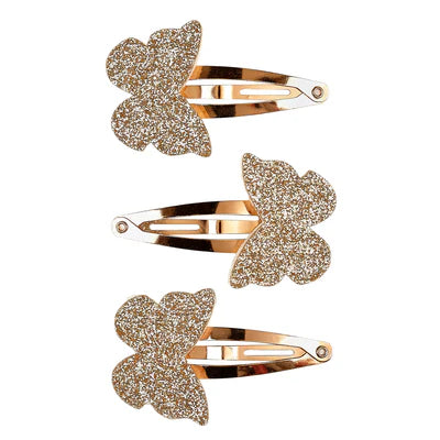 Pack de 3 clips de pelo metálicos, dorados, con un bonito detalle en forma de mariposas también doradas y cubierta de purpurina. De la marca Souza.