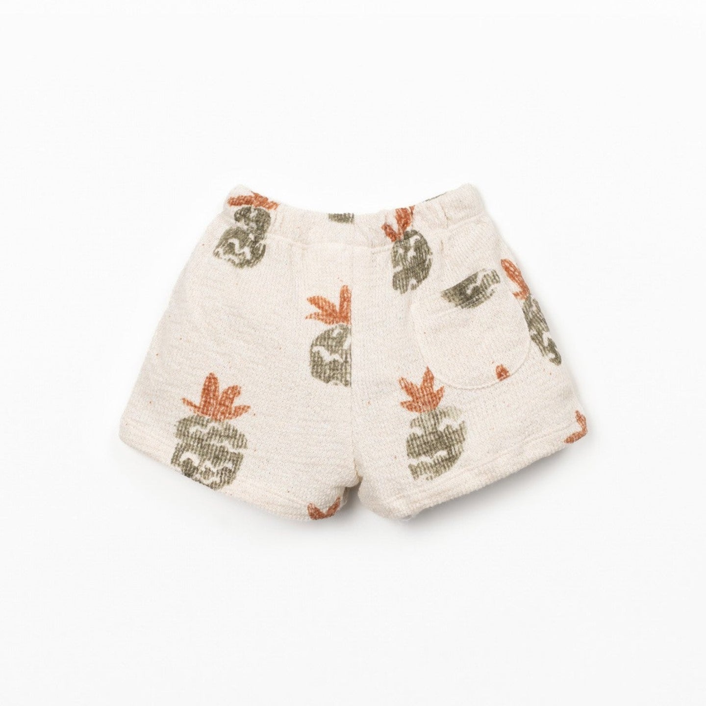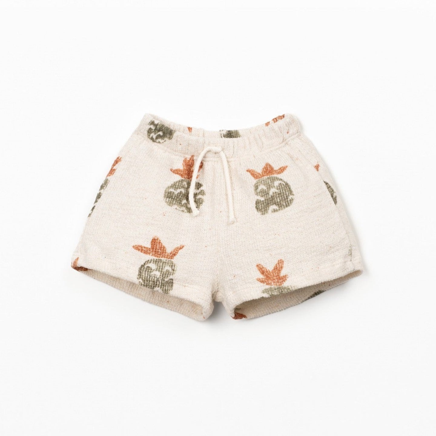 El Pantalón Corto Bebé Estampado de Piñas, de la marca portuguesa Play Up,  está confeccionado en punto con una mezcla de algodón regenerativo 90% y algodón reciclado 10%, en color crudo y con un estiloso estampado allover de piñas. Es un modelo con cintura elástica, y cordón decorativo. Una prenda muy confortable y fresca para el verano.