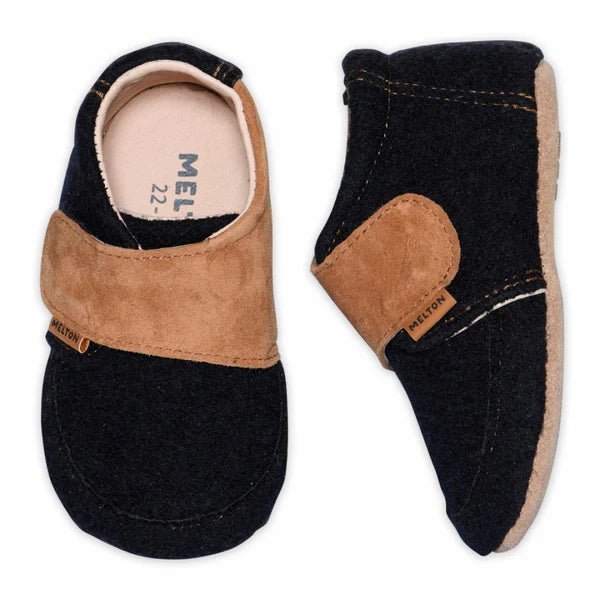 Estas acogedoras pantuflas de lana para bebé,  de la marca Melton, están confeccionadas con lana de alta calidad, con propiedades termorreguladoras, que evitan que los pies del niño se enfríen o se calienten demasiado. El cierre de velcro en ante permite un ajuste perfecto. La suela de ante con inserciones de goma proporciona un buen agarre y mayor estabilidad.