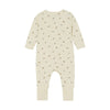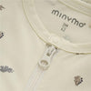 El pijama Mini Dinos, de la marca Minymo, está confeccionado en viscosa de bambú (93%) que garantiza una textura suave, transpirable e hipoalergénica, y un poco de elastano que proporciona un ajuste perfecto y libertad de movimiento. Es de color blanco crema y tiene pequeños diseños de dinosaurios. Cierre con cremallera frontal protegida (del cuello a la pernera) para evitar que moleste en la piel, y dobladillo que se pliega sobre los pies convirtiéndose en polaina, para una mayor calidez.