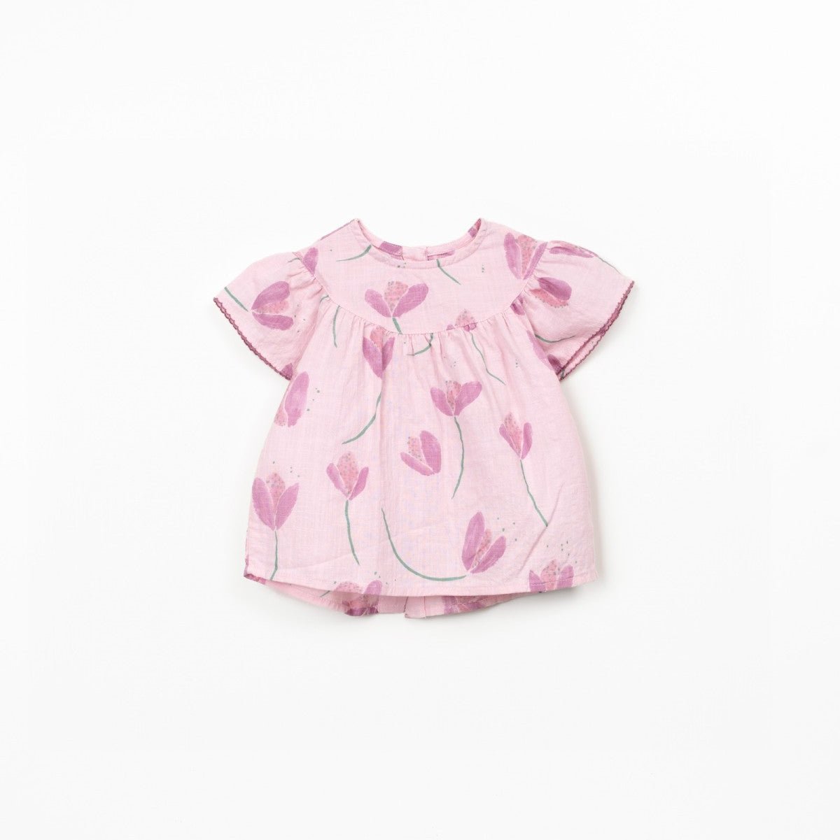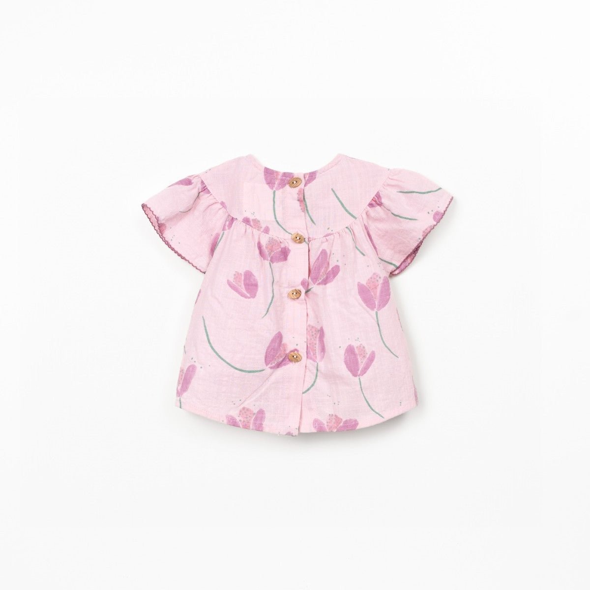 Túnica infantil de algodón orgánico de Play Up confeccionada en tejido de algodón orgánico en color rosa, diseñada para ofrecer suavidad, comodidad y estilo natural en el día a día. Este modelo de túnica para niña presenta cuello redondo y manga corta, ideal para los meses más cálidos. La abertura en la espalda con botones de coco facilita el vestido y aporta un acabado delicado y artesanal. Su diseño con la parte trasera ligeramente más larga añade fluidez y confort, mientras que el estampado de tulipanes aporta un toque dulce y veraniego. Una prenda infantil sostenible, ligera y fácil de combinar, perfecta para looks casuales y ocasiones especiales.